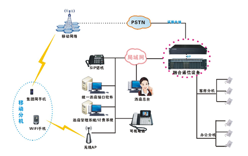 - 與PMS進(jìn)行信息交互,使IP-PBX系統(tǒng)與酒店原有系統(tǒng)徹底融合,同時(shí)可以對(duì)現(xiàn)有系統(tǒng)進(jìn)行平滑升級(jí),保證酒店的投資。提供IP終端租賃或使用軟電話方式,為這些機(jī)構(gòu)提供免費(fèi)通信服務(wù),同時(shí)在IP-PBX融合平臺(tái)的支持下,客人可以享受會(huì)議、視頻、語(yǔ)音信箱等特殊服務(wù)