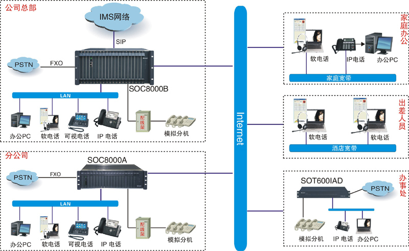 Ø 公司總部:在總部機(jī)房部署一臺(tái)SOC8000IPPBX,單機(jī)最大容量為1536線,通過(guò)SIP協(xié)議注冊(cè)到移動(dòng)IMS平臺(tái);同時(shí)提供E1/FXO接口與企業(yè)原電信運(yùn)營(yíng)商連接;通過(guò)以太網(wǎng)口接入Internet局域網(wǎng);